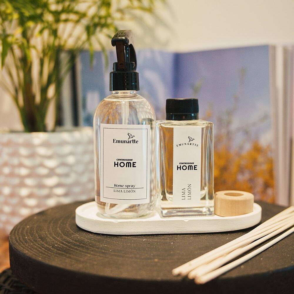 El set incluye un home spray y un difusor con varillas, ambos presentados en envases elegantes y minimalistas ideales para decorar cualquier ambiente.