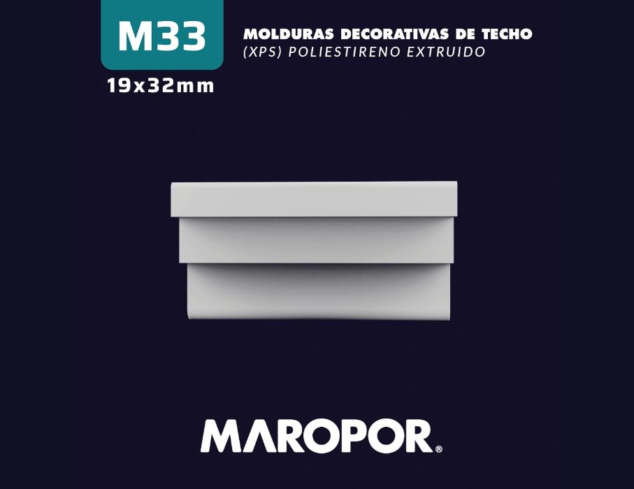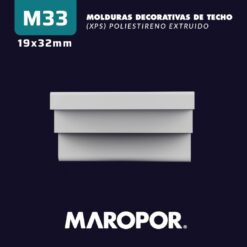 Moldura decorativa de EPS M33. La moldura M33 de EPS ofrece un diseño minimalista y elegante, ideal para espacios modernos. Sus líneas rectas y definidas proporcionan un acabado limpio y sutil, perfecto para quienes buscan simplicidad con un toque de sofisticación. Fabricada en poliestireno extruido de alta calidad, la M33 es resistente a la humedad y fácil de instalar, garantizando durabilidad y una integración perfecta en cualquier ambiente.