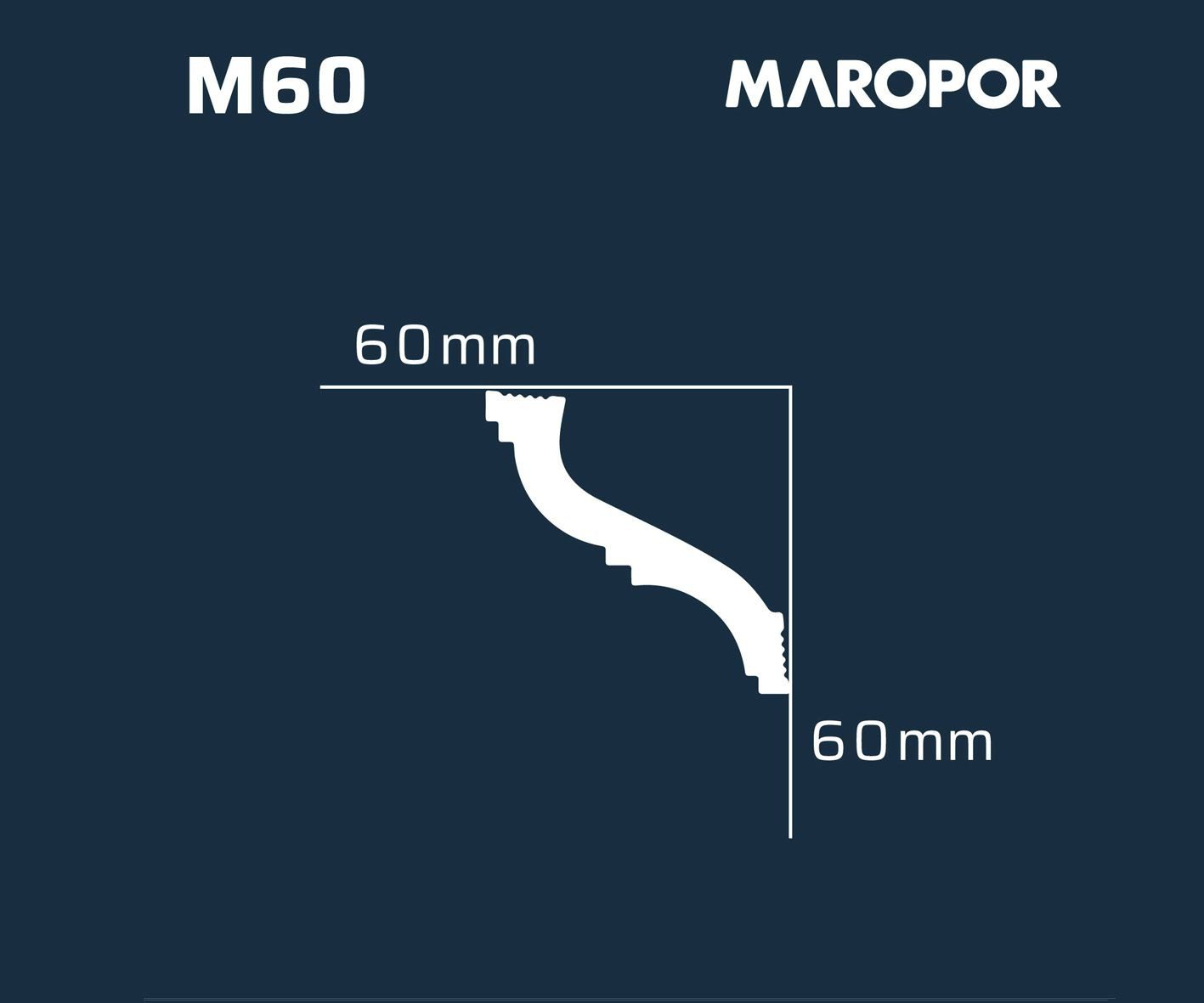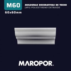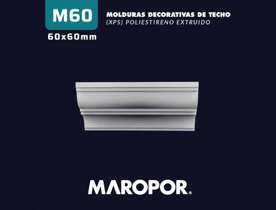 La moldura modelo M60 de Maropor destaca por su perfil detallado y elegante, compuesto por múltiples líneas y curvas que aportan profundidad y riqueza visual. Este diseño intrincado es ideal para aquellos que buscan un acabado que combine sofisticación y un toque decorativo pronunciado. La M60 enmarca la transición entre el techo y la pared con gran estilo, creando un ambiente distinguido y lujoso, perfecto para interiores que desean realzar su carácter y elegancia.