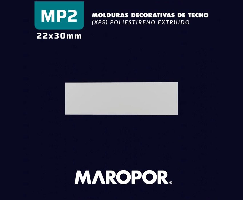 La moldura modelo MP2 de Maropor mantiene el diseño recto y moderno de la línea, con un tamaño intermedio que equilibra presencia y sutileza. Es una excelente opción para quienes buscan un detalle decorativo sobrio pero con mayor protagonismo visual. Se integra con armonía a ambientes contemporáneos, brindando un cierre elegante y equilibrado entre techo y pared.